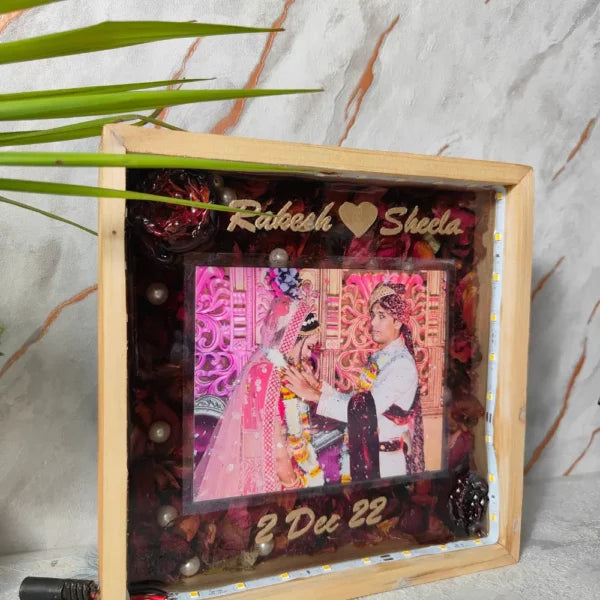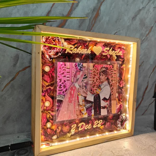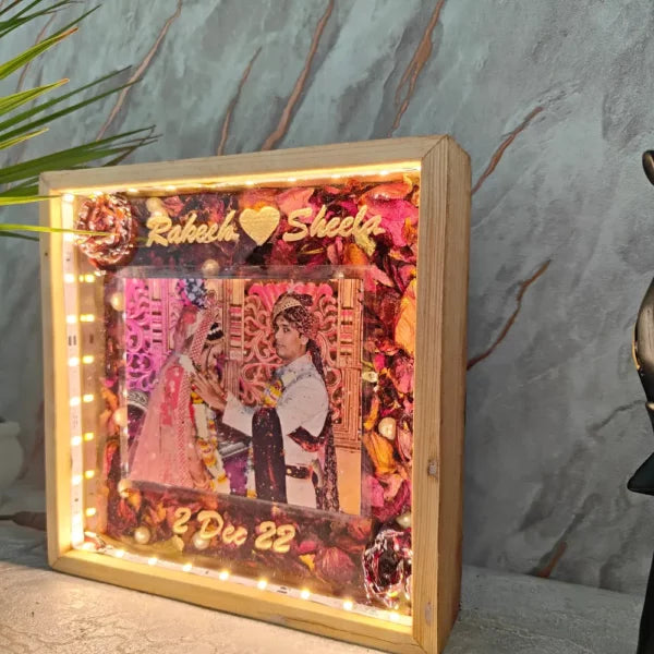 Imbue your bedroom decor with the magic of our Square Resin Varmala Photo Frame. This exquisite piece, with a 1.5-inch depth, is a custom wedding details preservation marvel. Illuminate your cherished moments with the embedded LED lights, transforming it into a mesmerizing night lamp. Jaimala Preservation takes a new form as this rectangle varmala preservation frame elegantly showcases wedding flowers, preserving the essence of your special day. This 8-inch wedding memento encapsulates the beauty of your union, combining the traditional with the contemporary. Step into the future of online flower preservation services with this unique and captivating creation, a perfect addition to your bedroom decor.