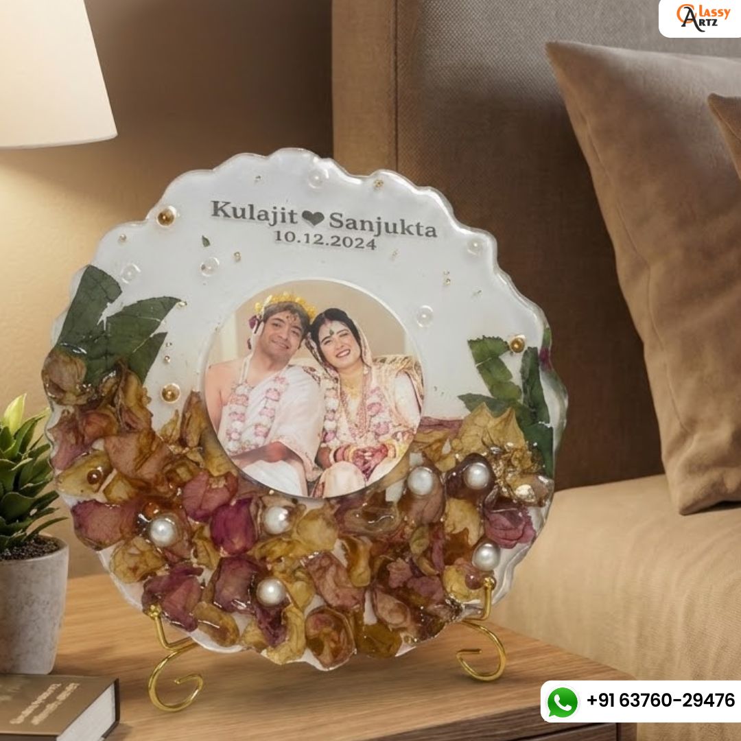 Preserve the beauty of your wedding day with this Personalized Wedding Varmala Resin Frame. This round resin keepsake carefully encases your wedding varmala flowers, wedding photograph, pearls, and dried floral elements in a durable, glossy epoxy resin frame. The wavy edge design adds an elegant touch, making it a perfect piece for home décor.