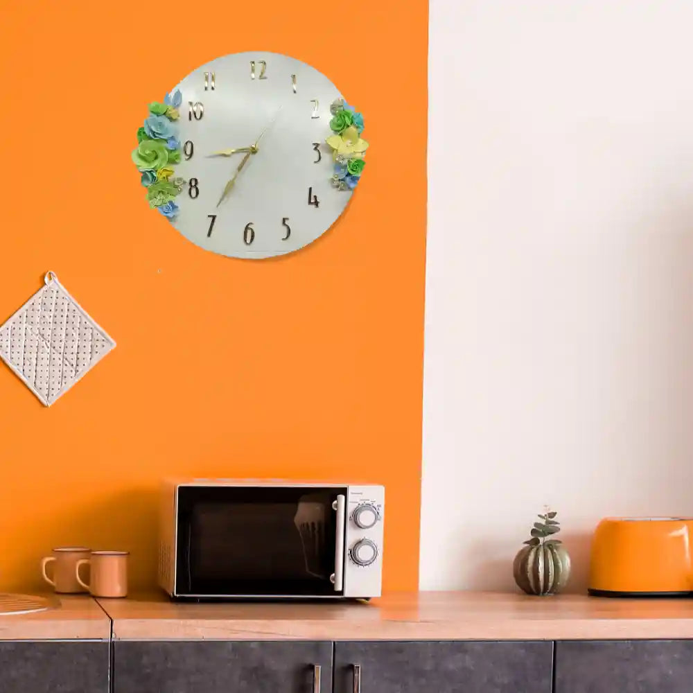 Add a touch of elegance to your space with this Floral Acrylic Wall Clock, a beautiful and functional piece of decor. This round designer wall clock features delicate floral accents and a sleek golden number display, making it a perfect mix of beauty and practicality.