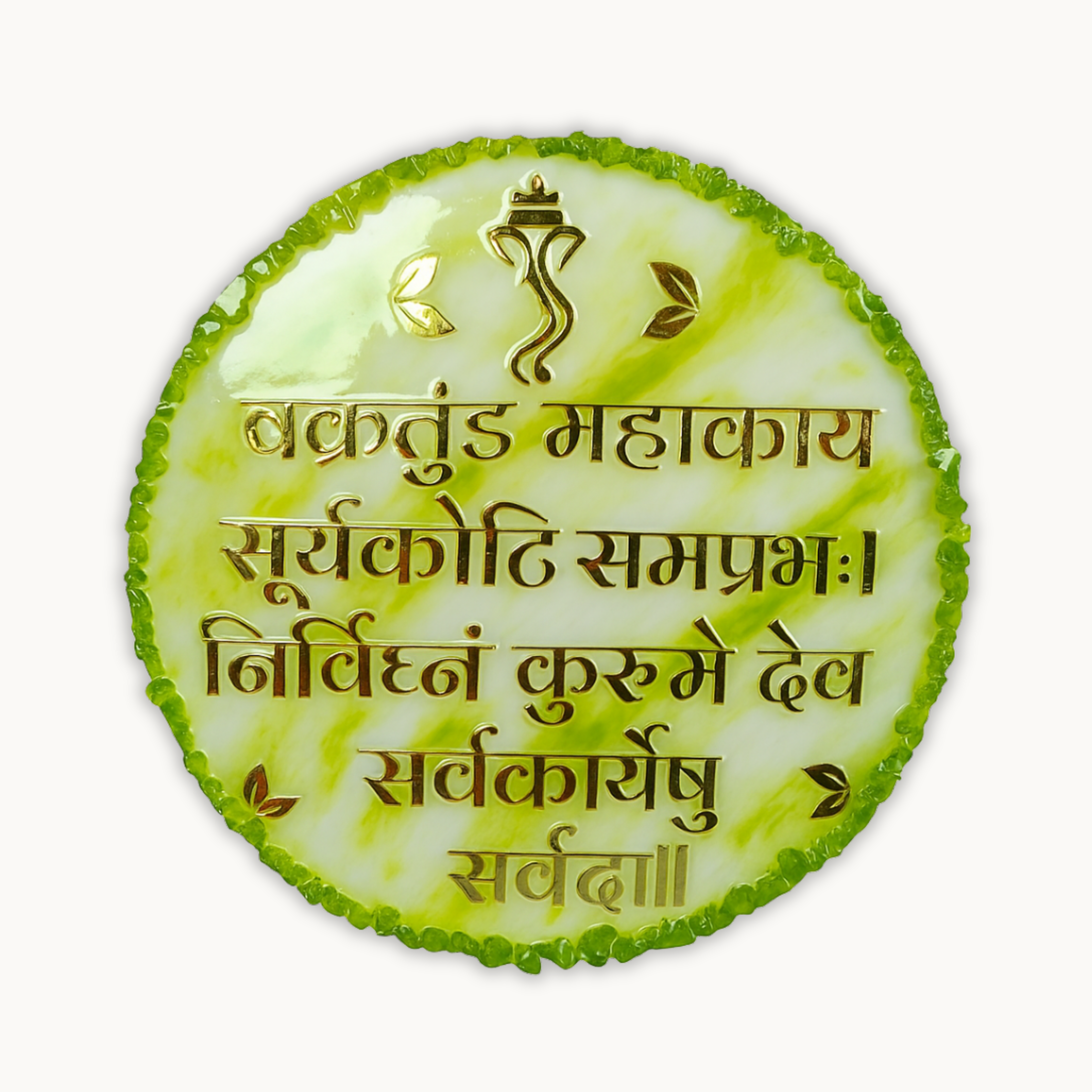 Add a touch of peace and positivity to your home with this beautiful Resin Ganesh Mantra frame. The round shape with a green-white mix gives it a fresh, calming look, making it perfect for Hindu homes and temples. This mantra frame in resin is a lovely addition to your space during new home renovation or new home making.