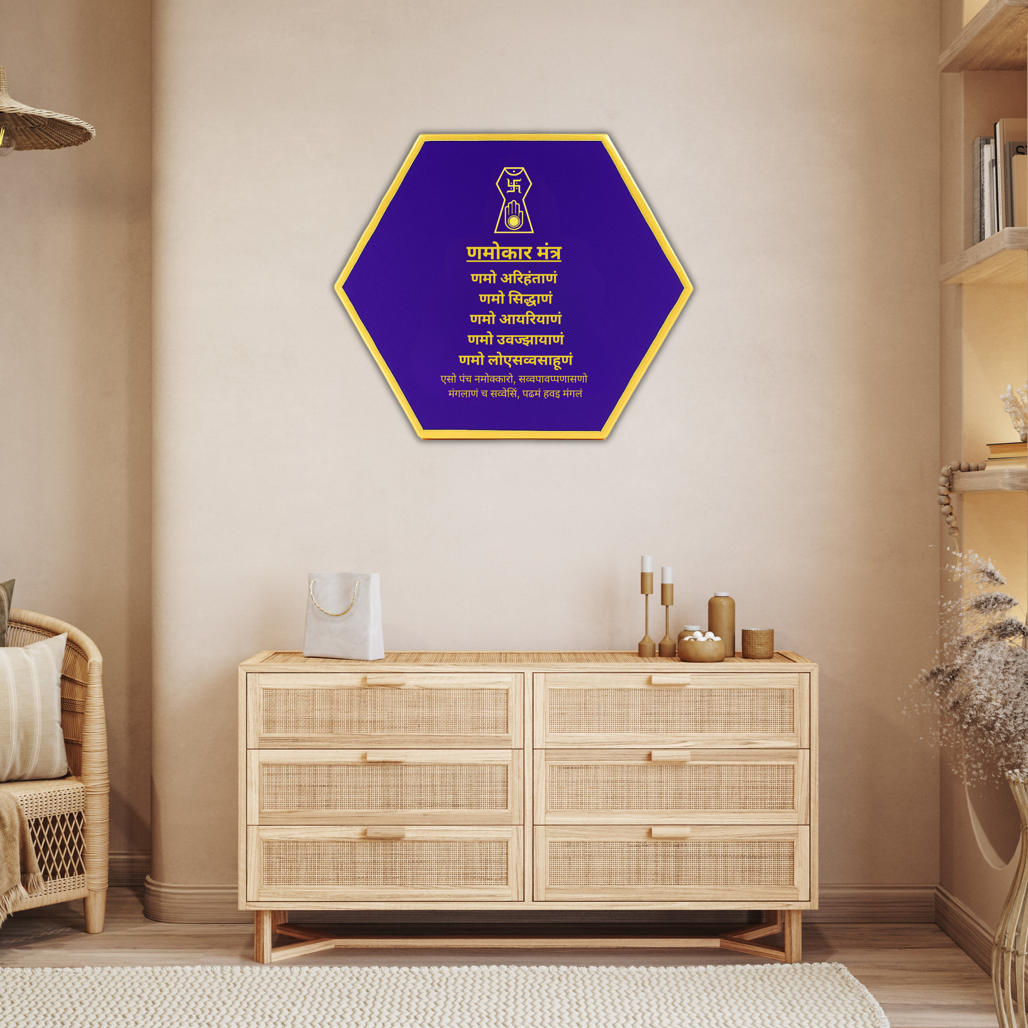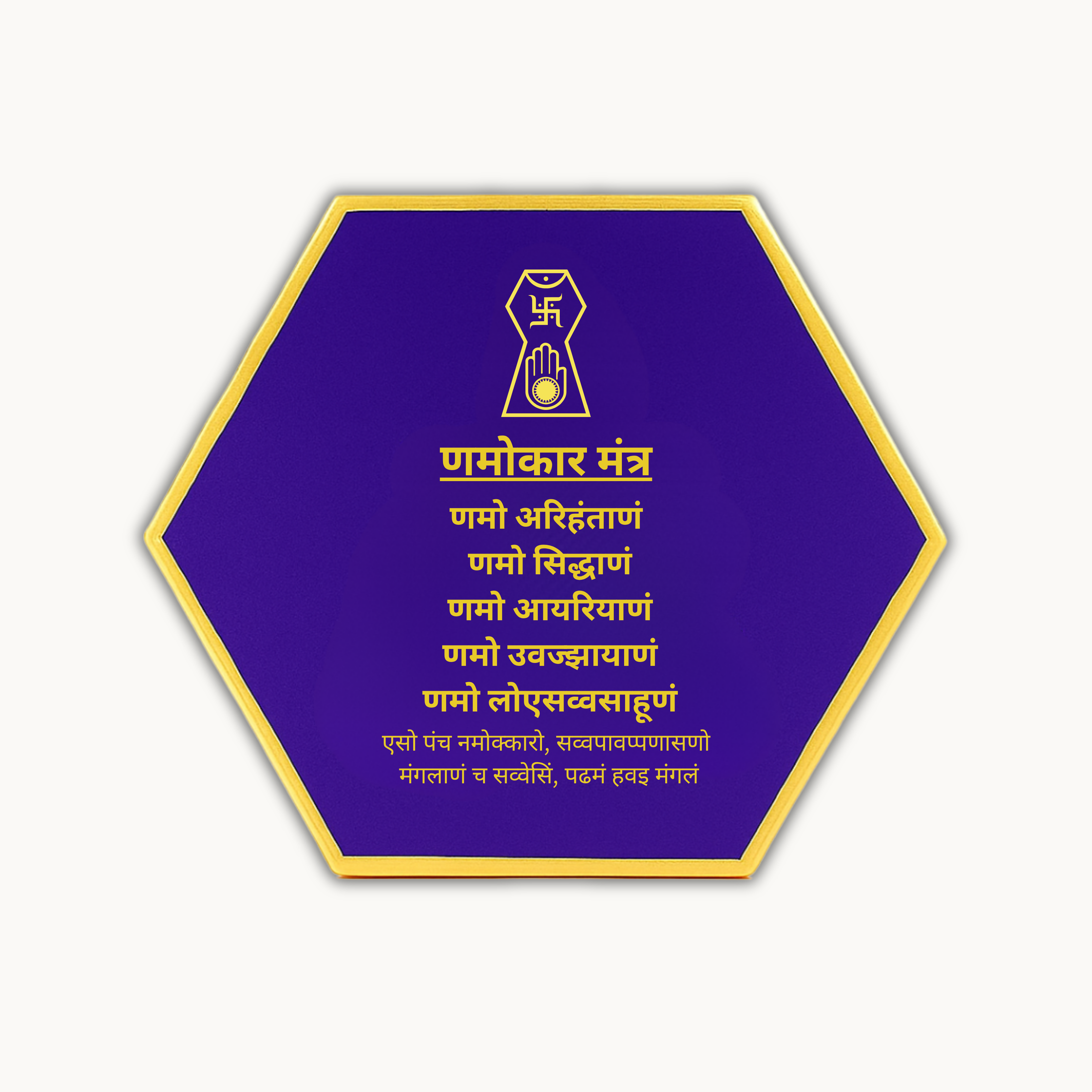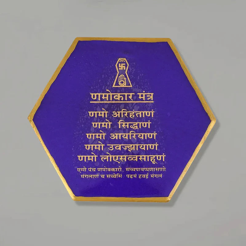 Enhance your home with this stunning hexagon Navkar Mantra frame in resin. With a rich purple finish and golden details, this luxury handmade mantra frame adds a peaceful and spiritual vibe to any room. Perfect for Hindu households, it fits beautifully in temples, living rooms, or as part of your new home renovation or new home making décor.