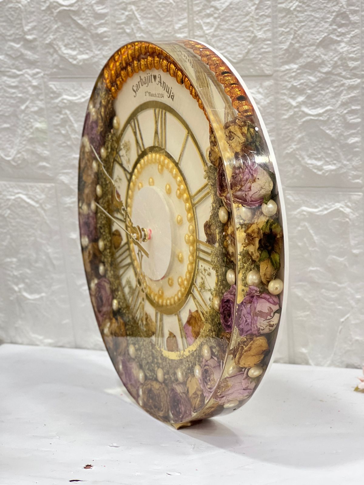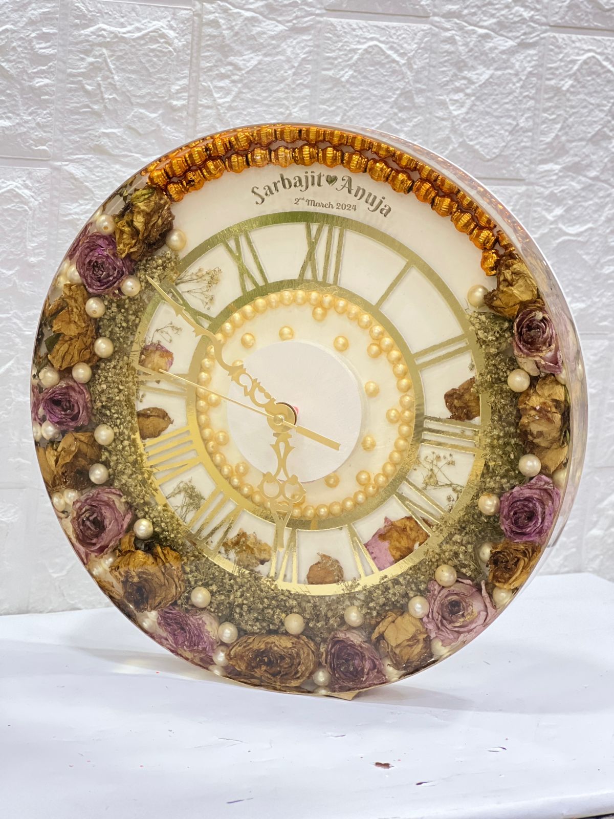 Add a touch of timeless elegance to your space with this premium resin wall clock, a stunning piece that beautifully blends art and function. This custom floral wall clock is handcrafted with high-quality epoxy resin, featuring real dried wedding roses, pearls, and gold beads embedded within, creating a rich and sophisticated design. The round clock face with Roman numerals enhances its vintage charm, making it an exquisite addition to any home or office.