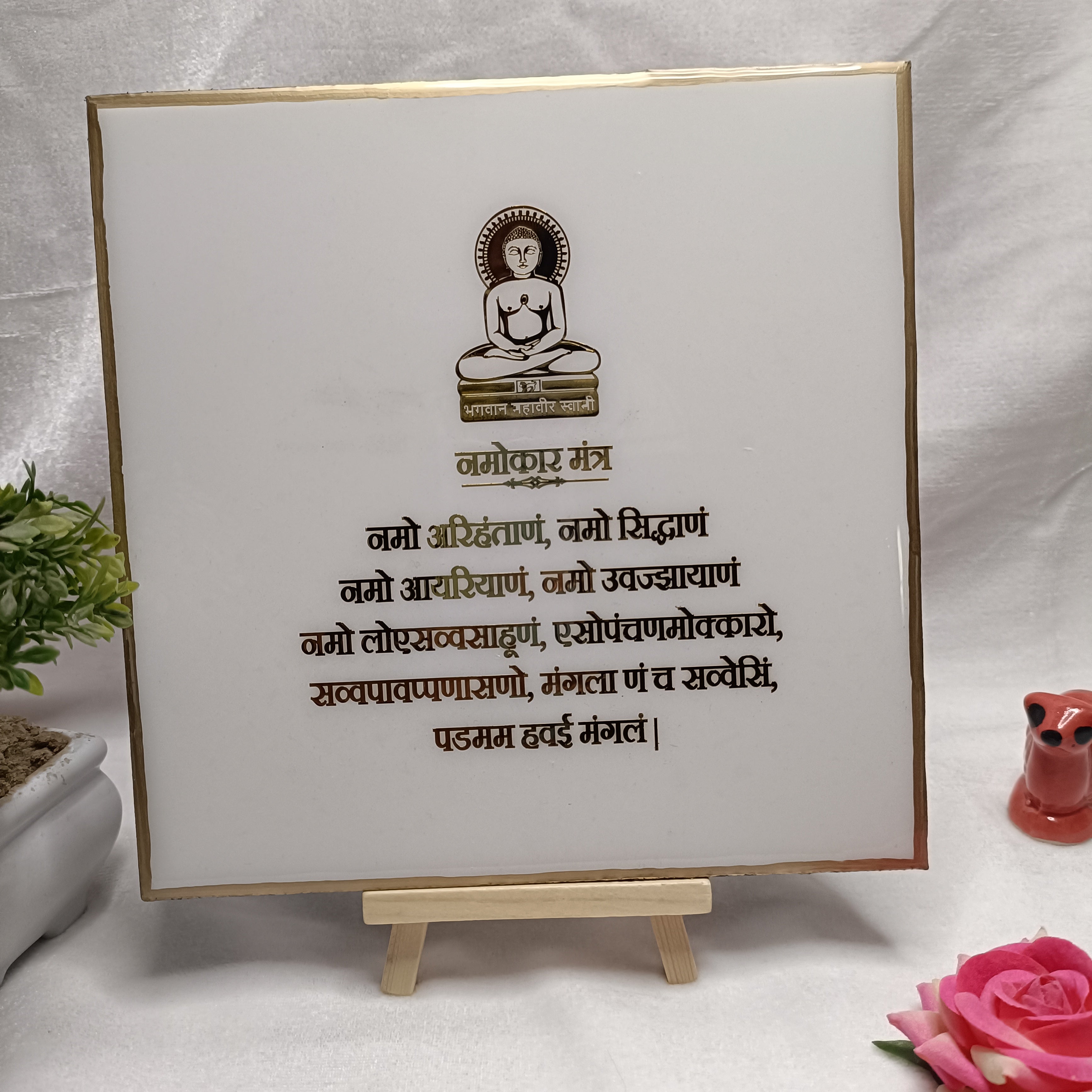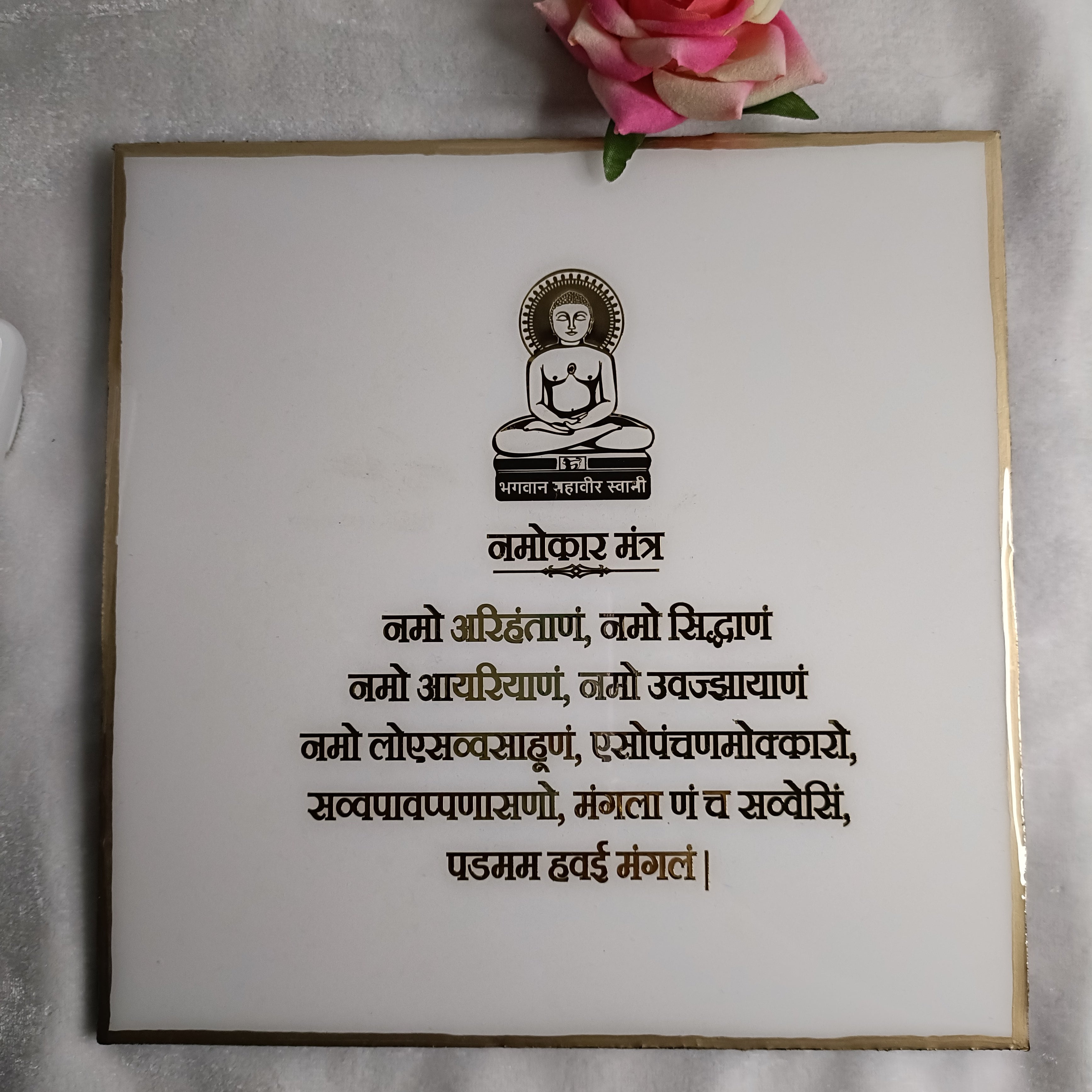 Add positivity and blessings to your space with this luxury handmade resin mantra frame featuring the sacred Navkar mantra. Made with high-quality epoxy resin, this epoxy resin mantraplate is beautifully crafted with a golden border and engraved mantra that brings peace, respect, and spiritual strength. Perfect for Jain homes, temples, or meditation areas, it enhances the atmosphere with calm and purity.