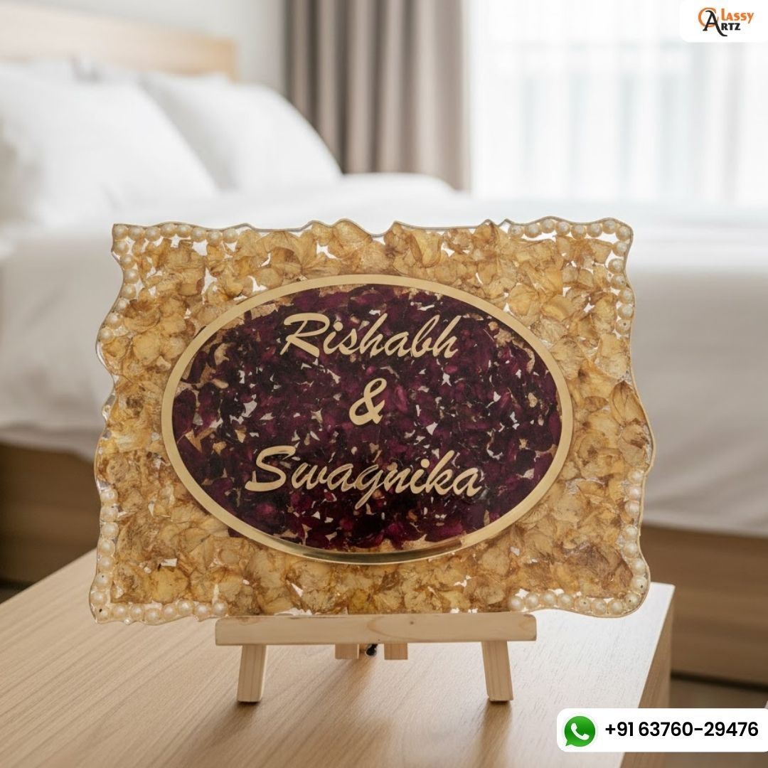 Upgrade your home décor with this luxury handmade resin nameplate featuring real dried varmala flowers, pearl accents, and elegant gold lettering. Designed to add a sophisticated charm, this customized home sign is crafted with high-quality resin, ensuring durability and a premium look.