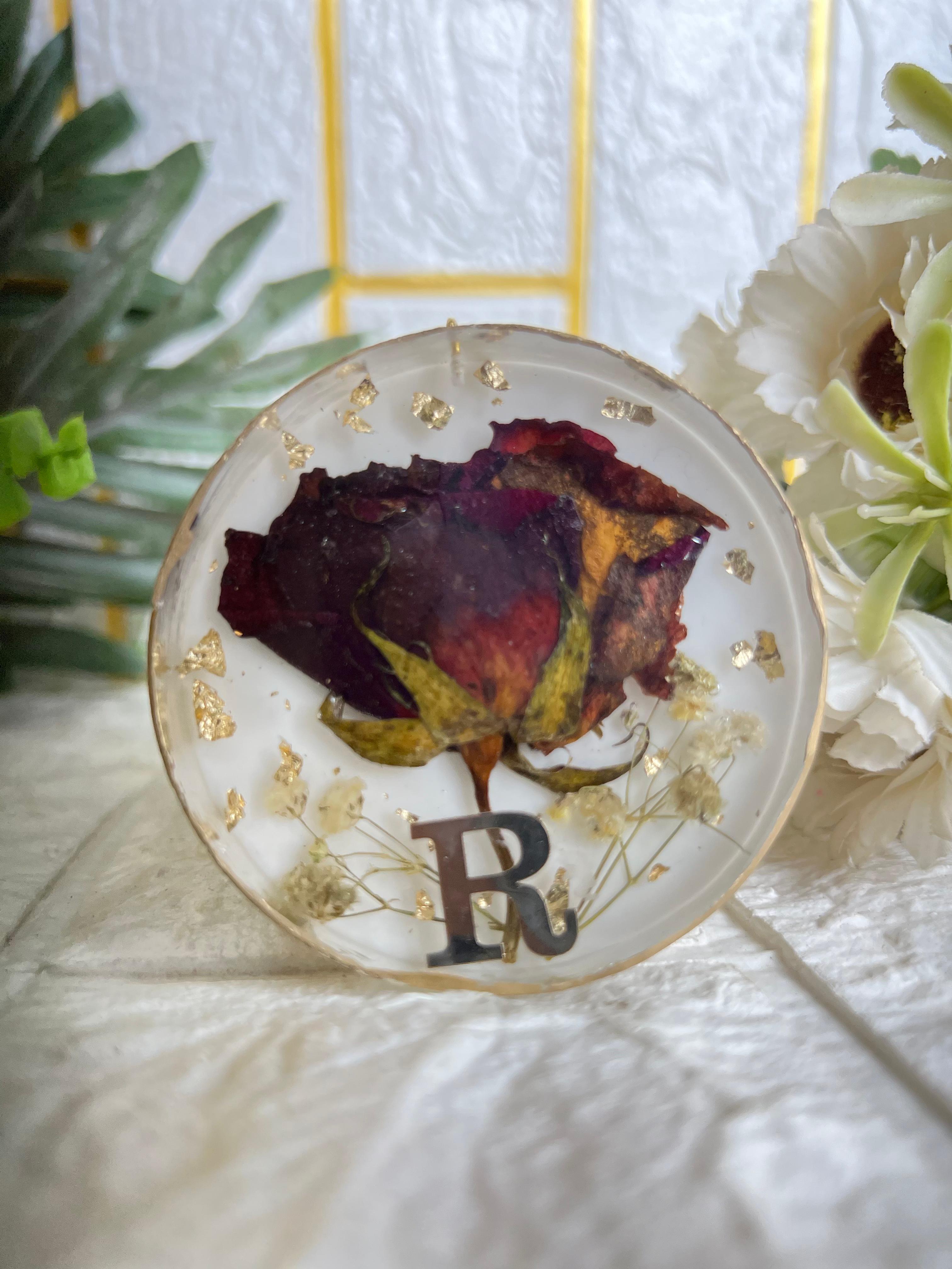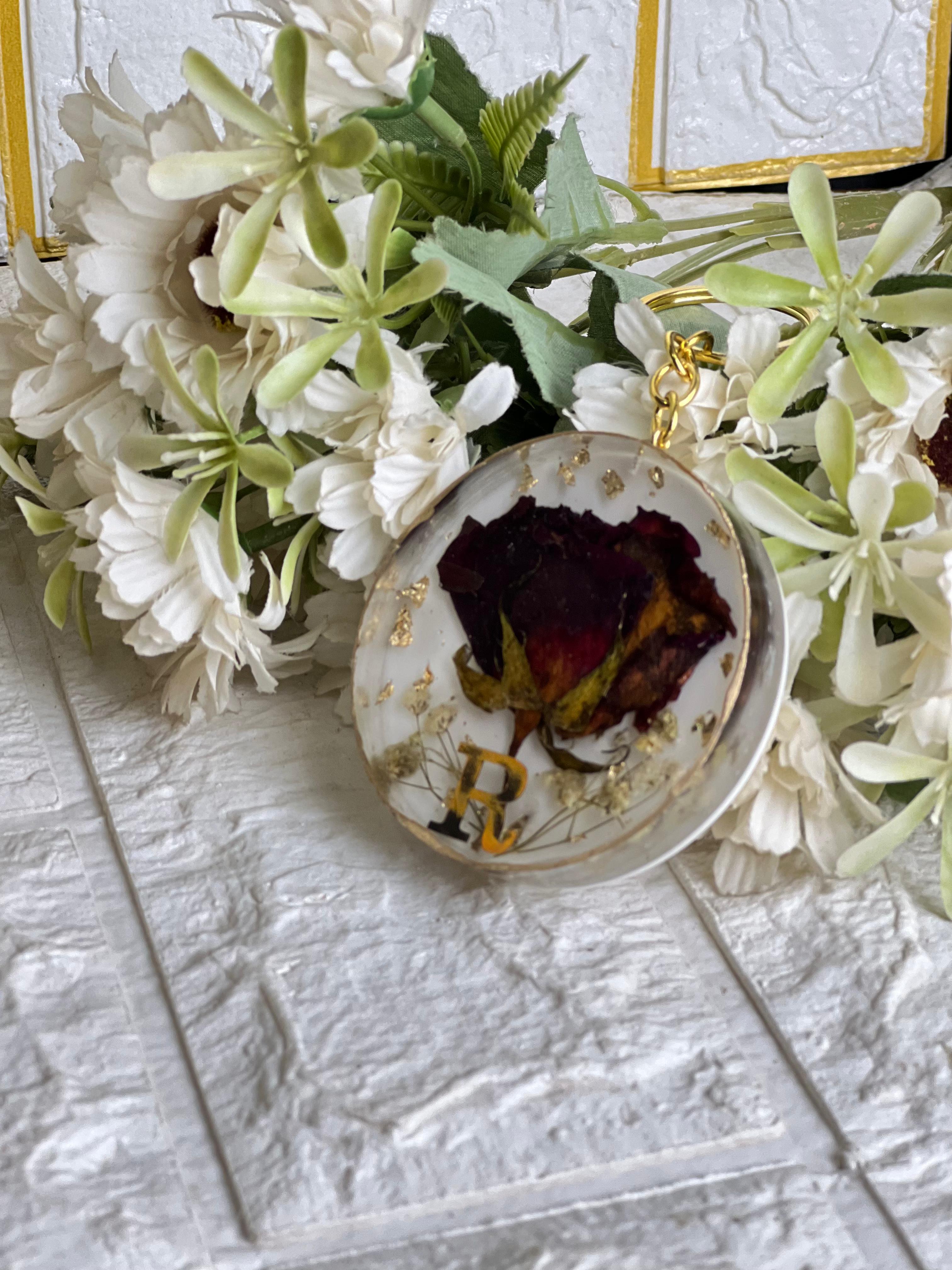Resin 3inch round Bag charm with R written Single Rose Flowers Preservation