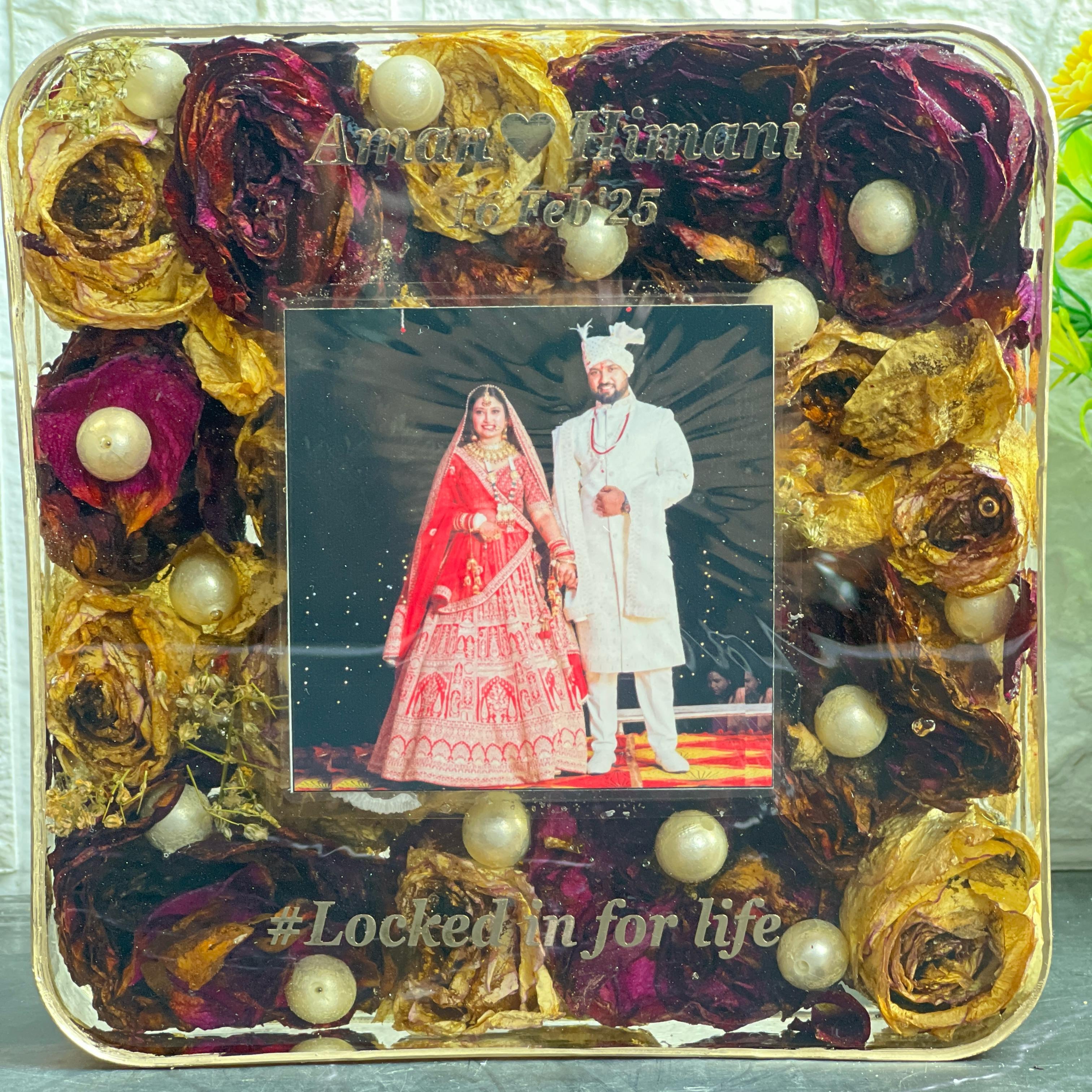The square resin frame beautifully showcases your wedding photo along with personalized name engraving and wedding date. The addition of pearls and dried floral decorations gives it a luxurious and elegant look.