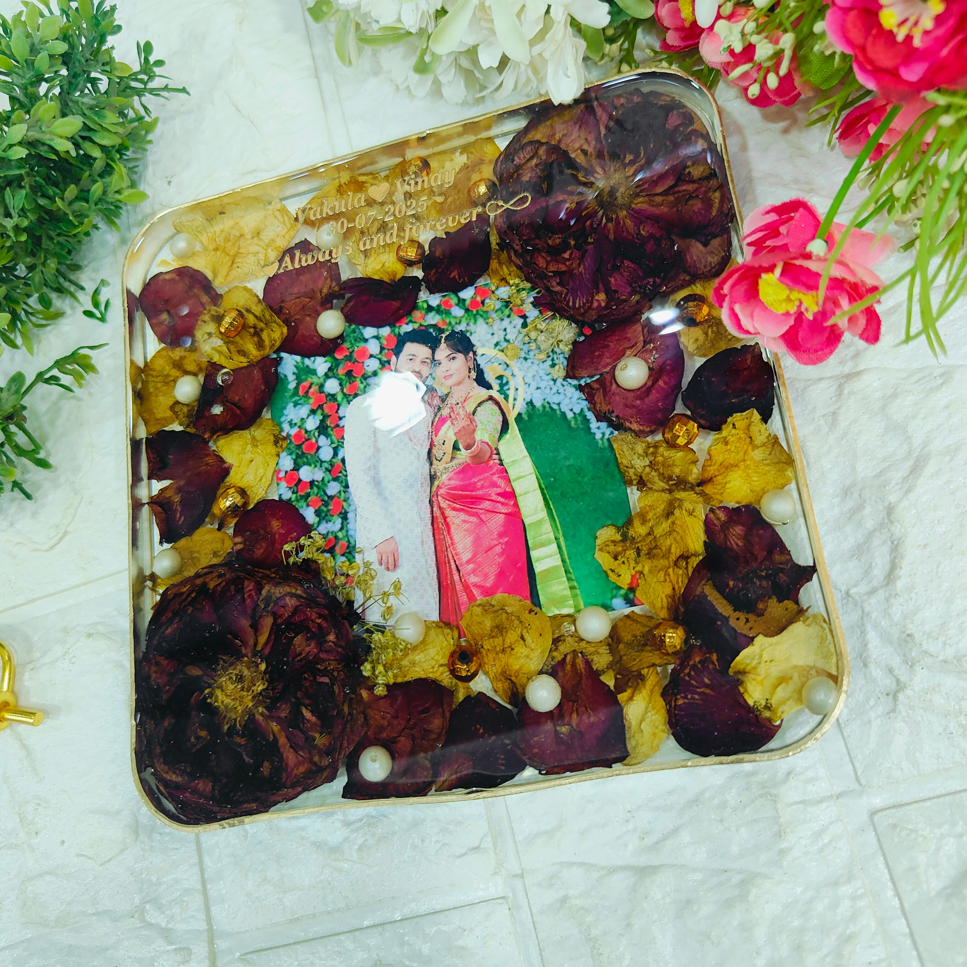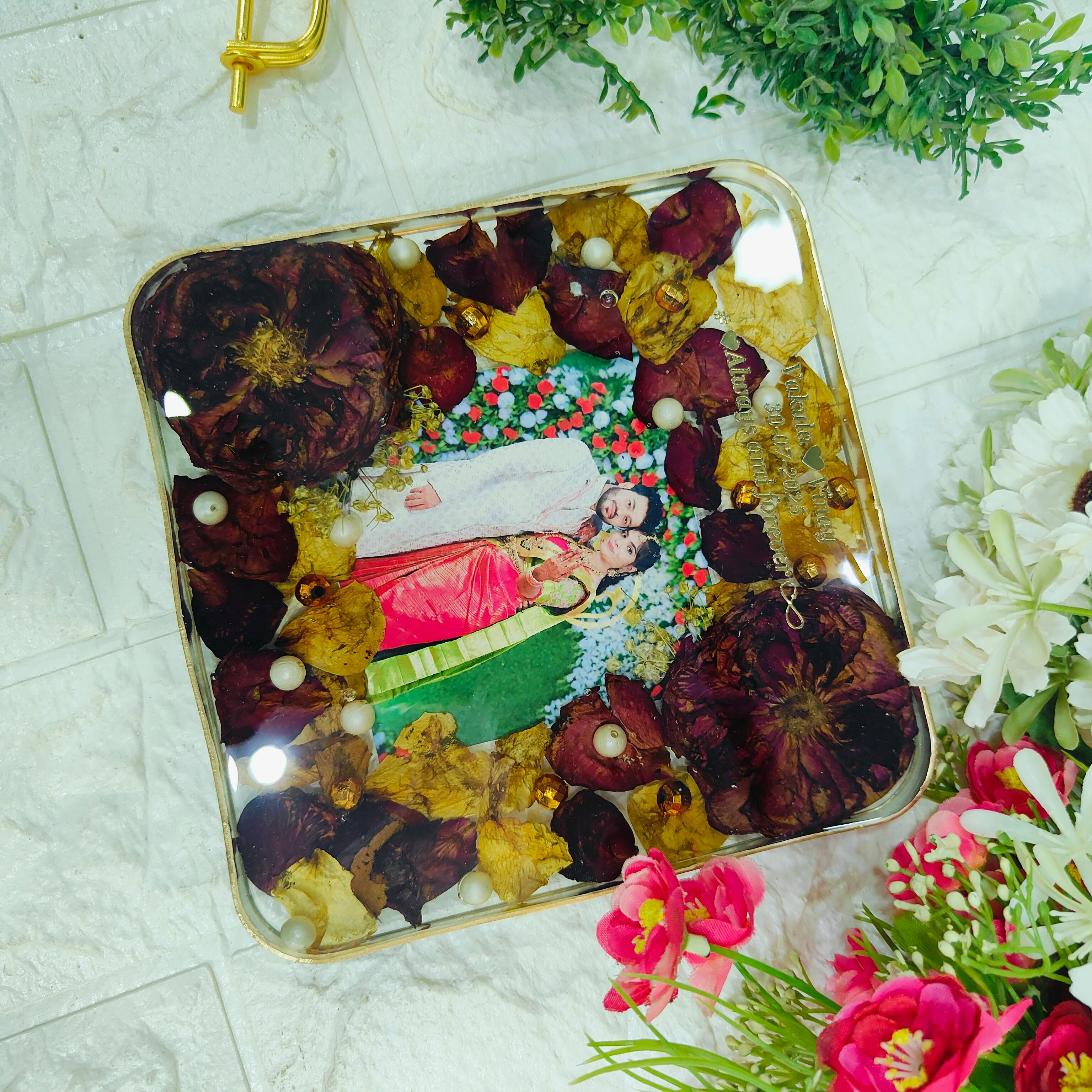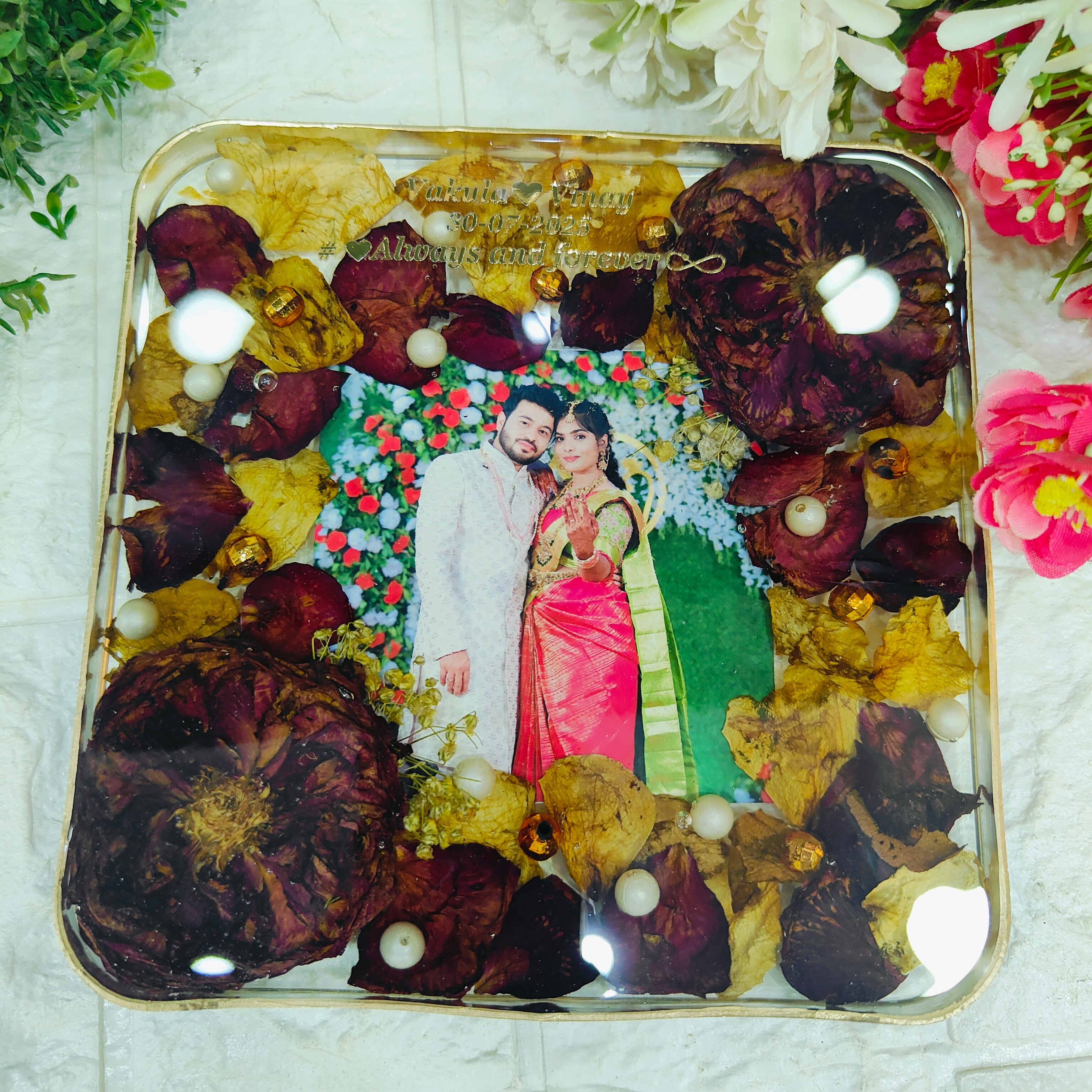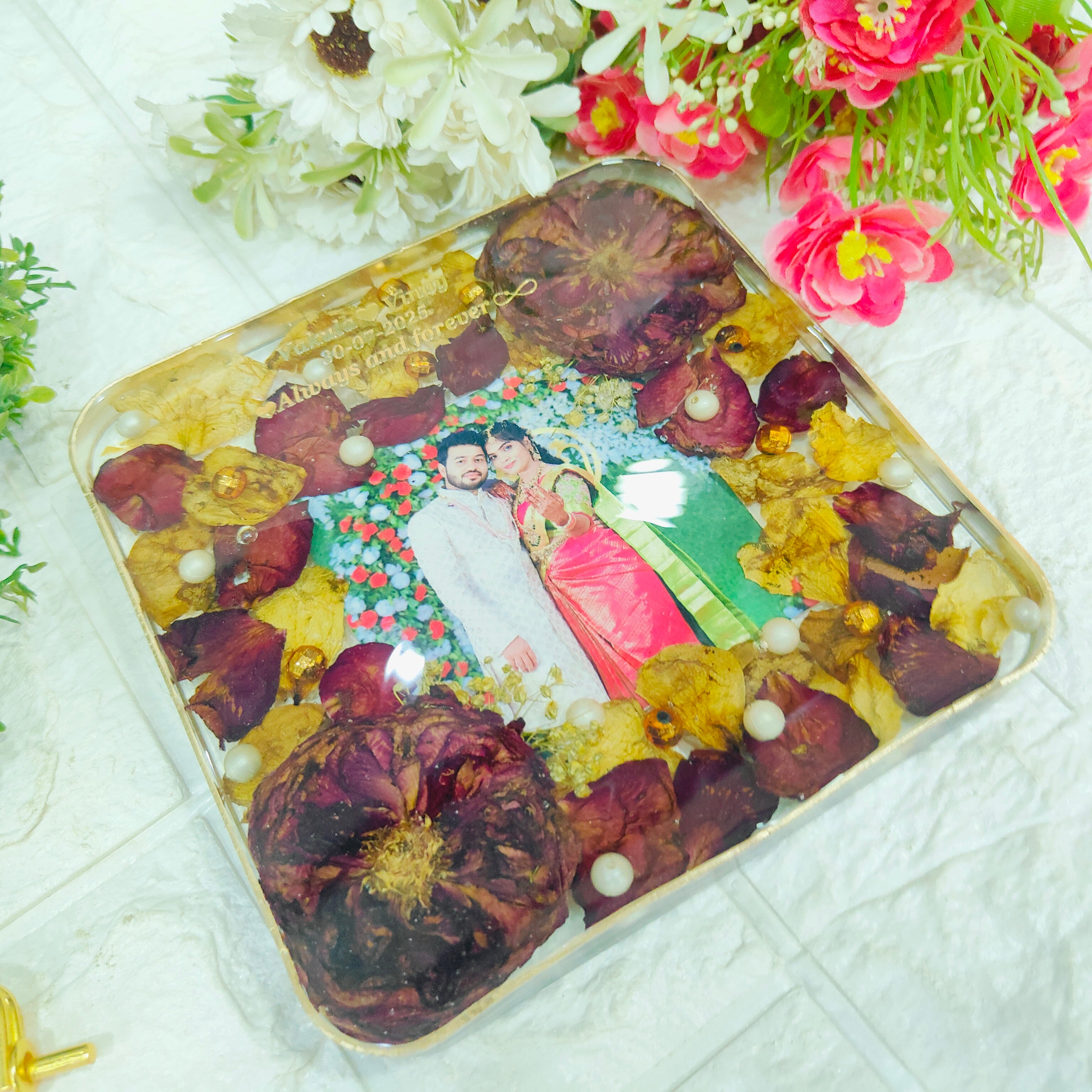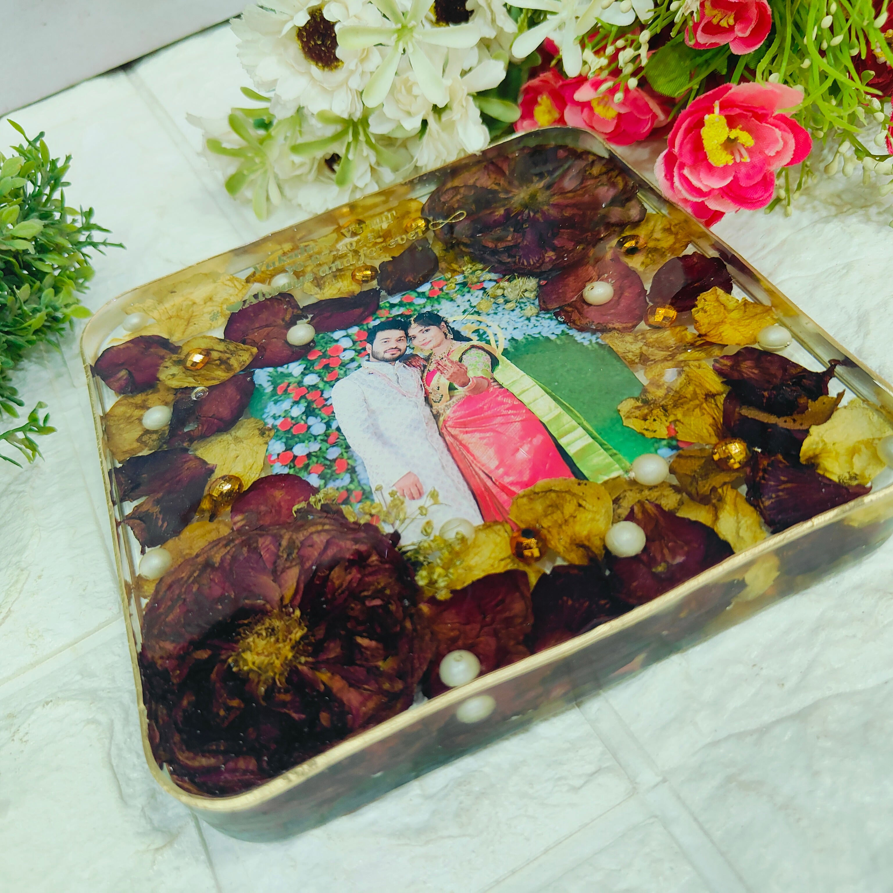 Resin 6inch block with Red & White Flowers with Couple photo & Name date with metal stand Varmala Preservation