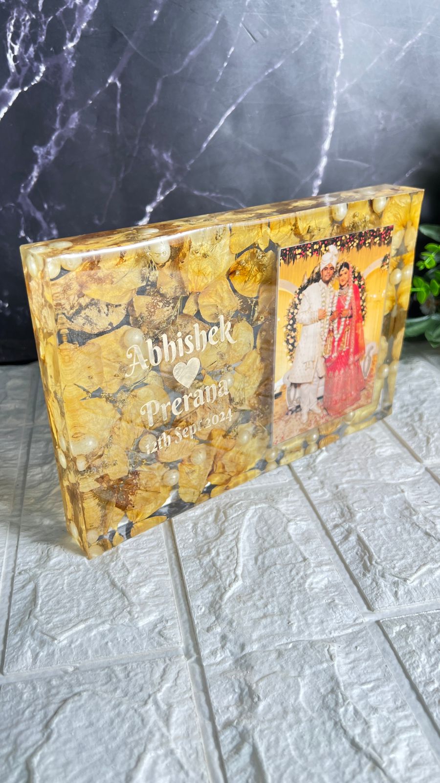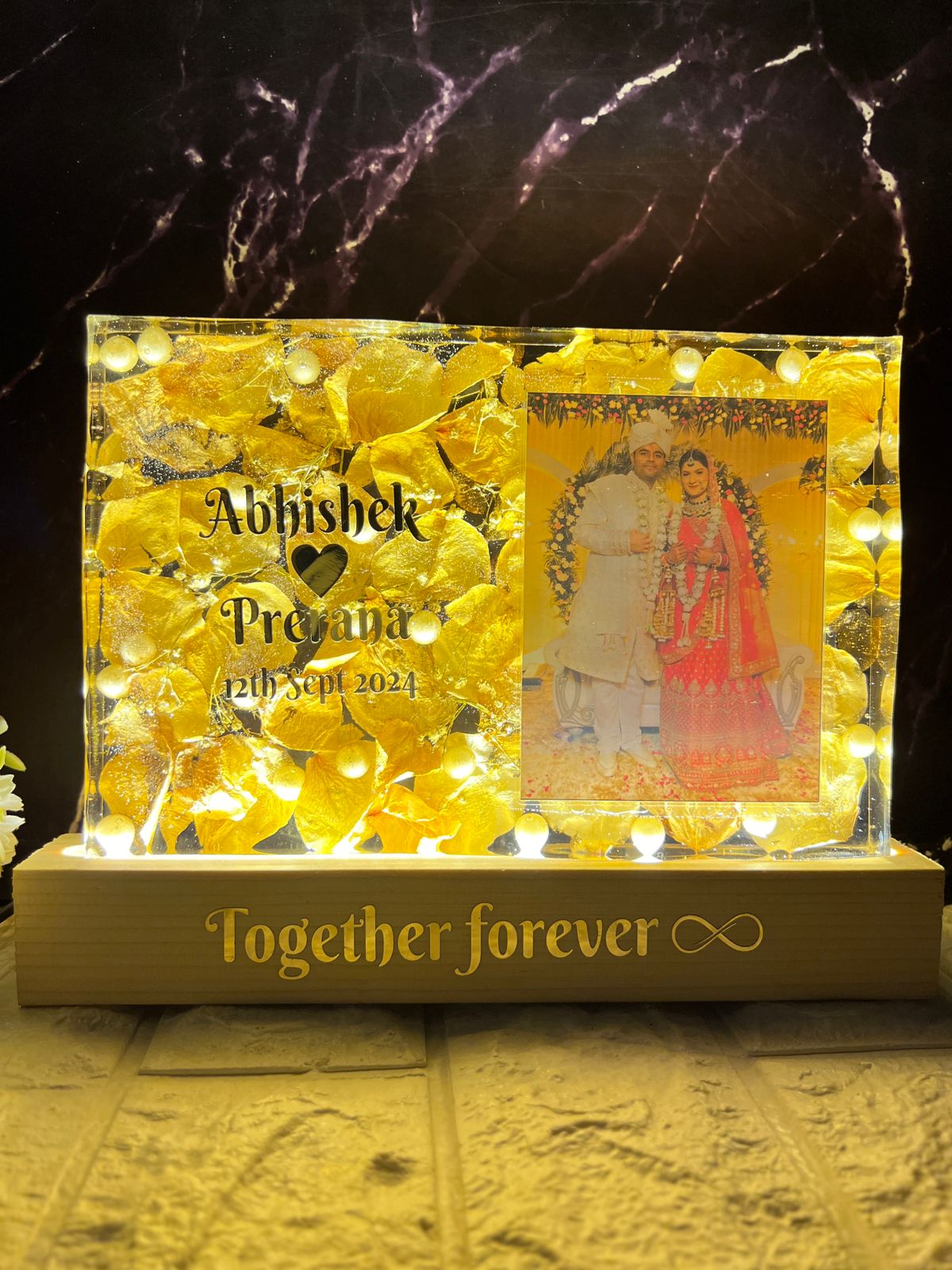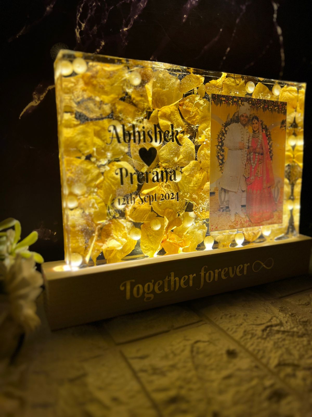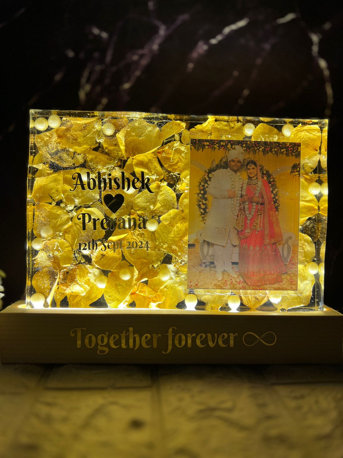 Resin 9 by 6inch Recatngular shape with white petals and couple photo and Name,Date,Hastag, with LED stand Varmala preservation