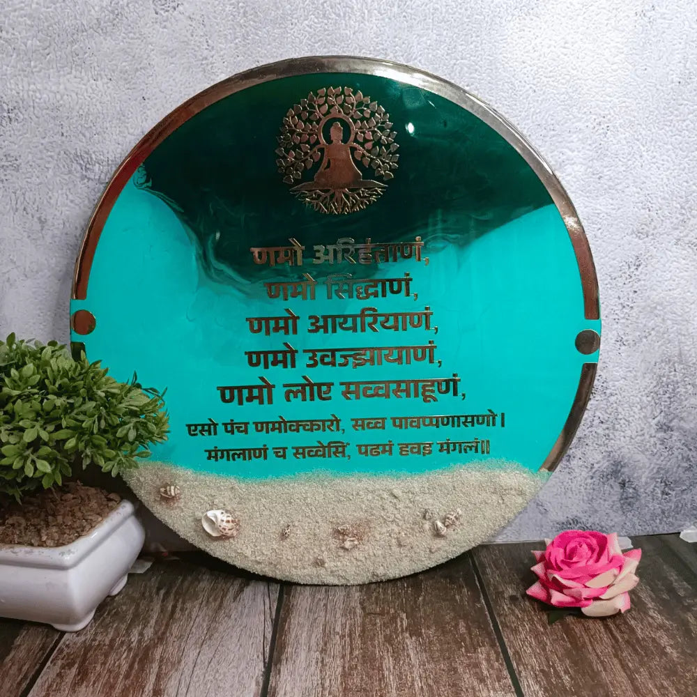 This handmade luxury resin mantra frame features the divine Navkar Mantra, bringing peace, positivity, and spirituality into your space. The epoxy resin mantra plate is crafted with an ocean blue gradient design, symbolizing serenity and wisdom.