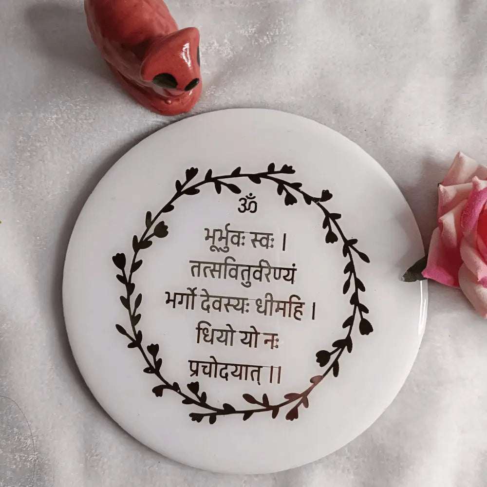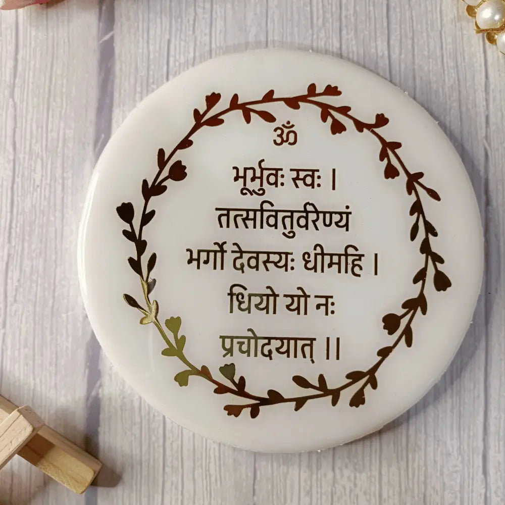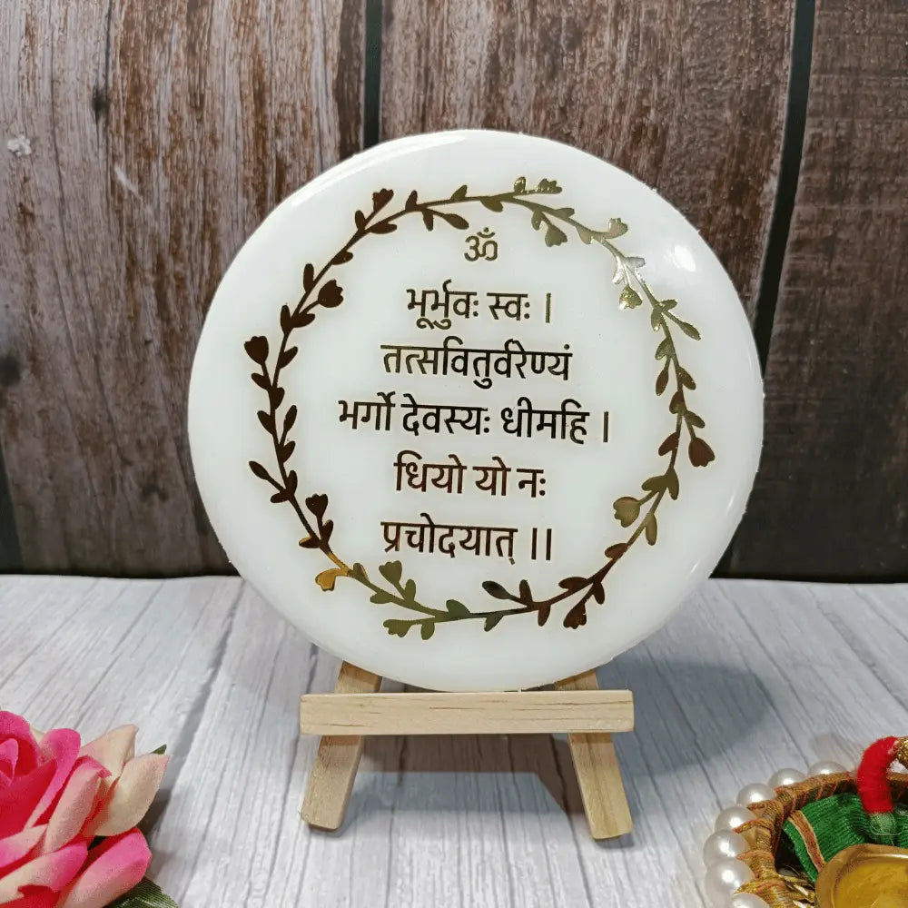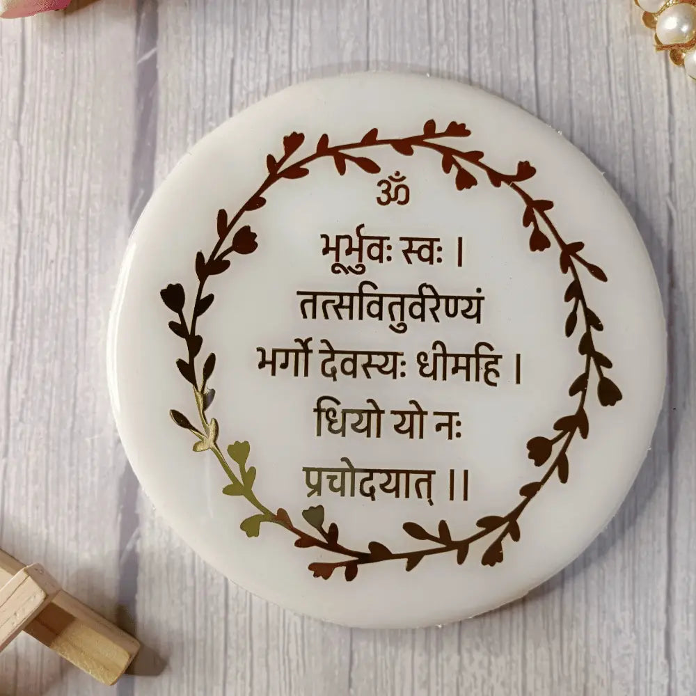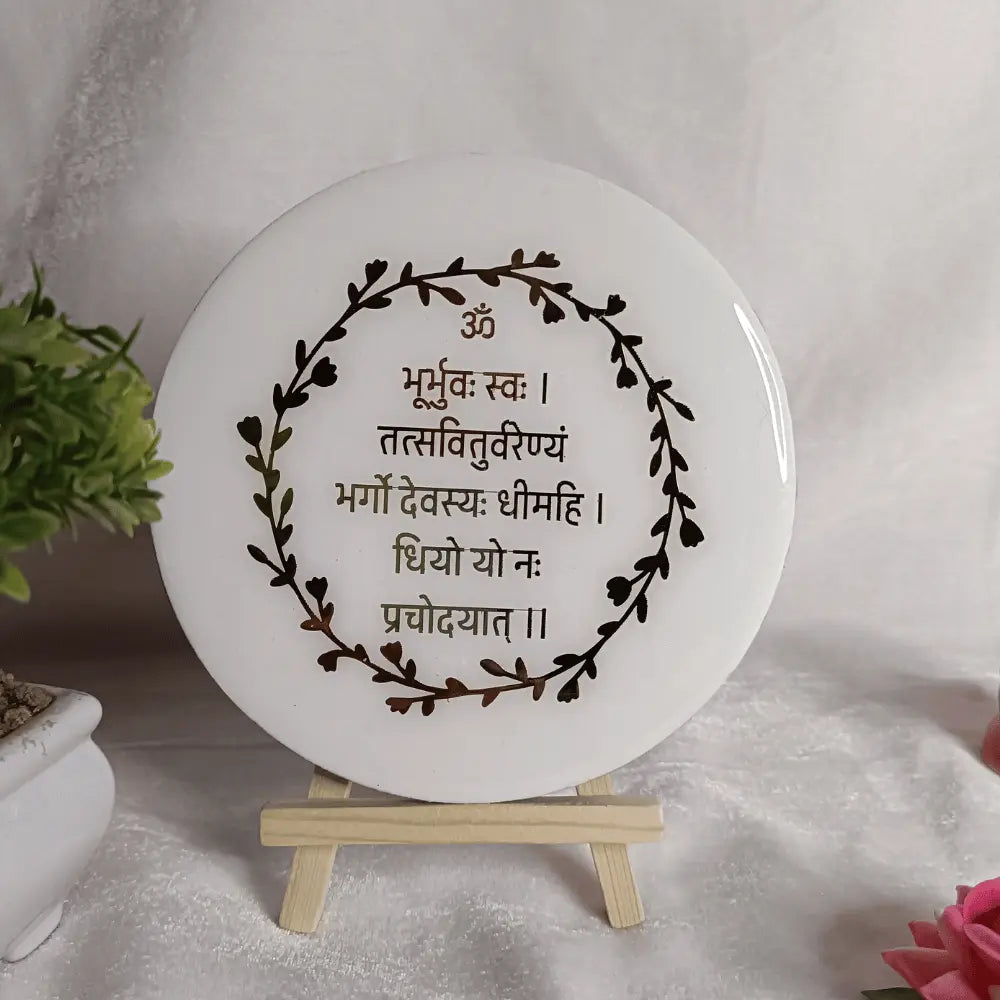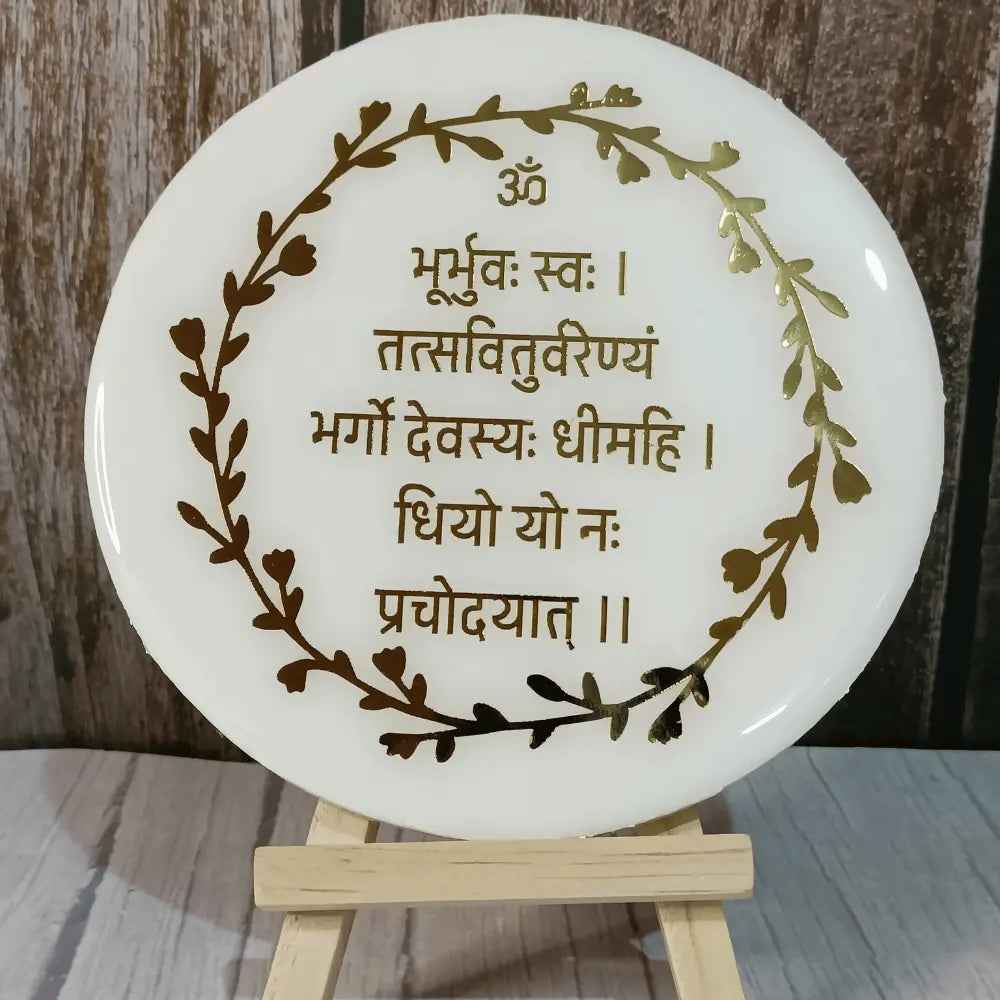 This mini resin mantra frame with the sacred Gayatri Mantra brings peace, focus, and good energy to any space. The round shape with a white base and floral design gives it a soft and calming look. Handmade with love, this epoxy resin mantraplate is perfect for temple corners, work desks, or meditation shelves.