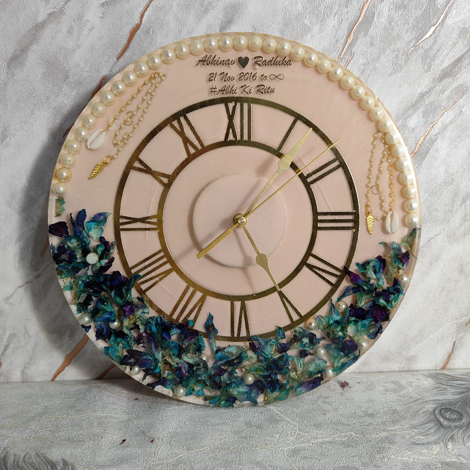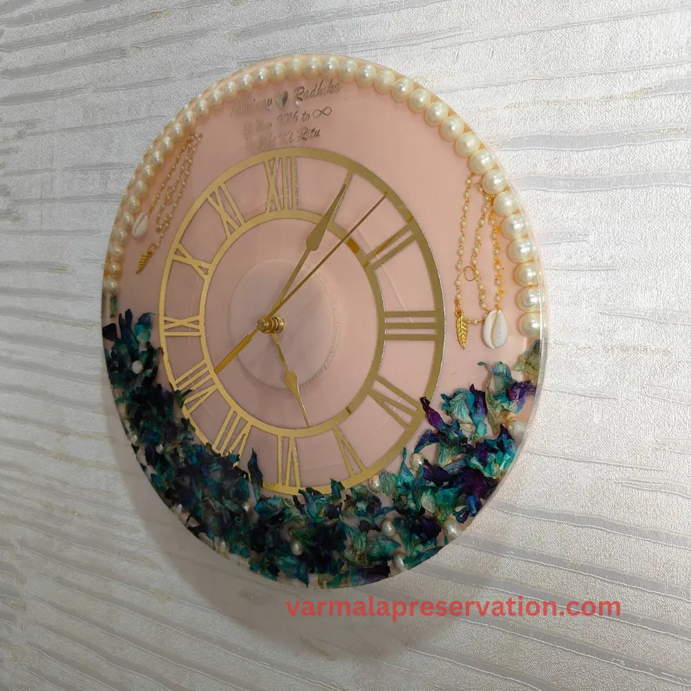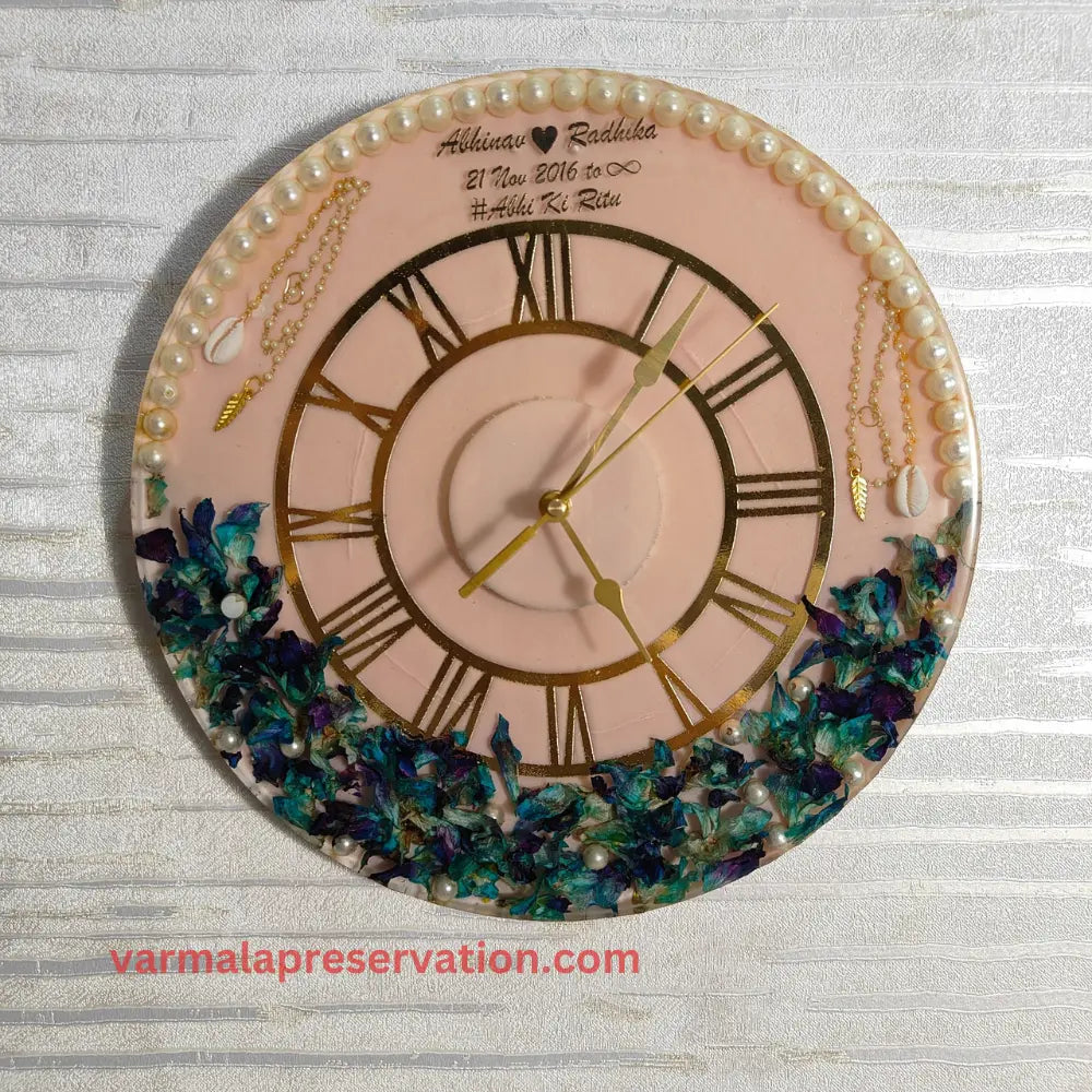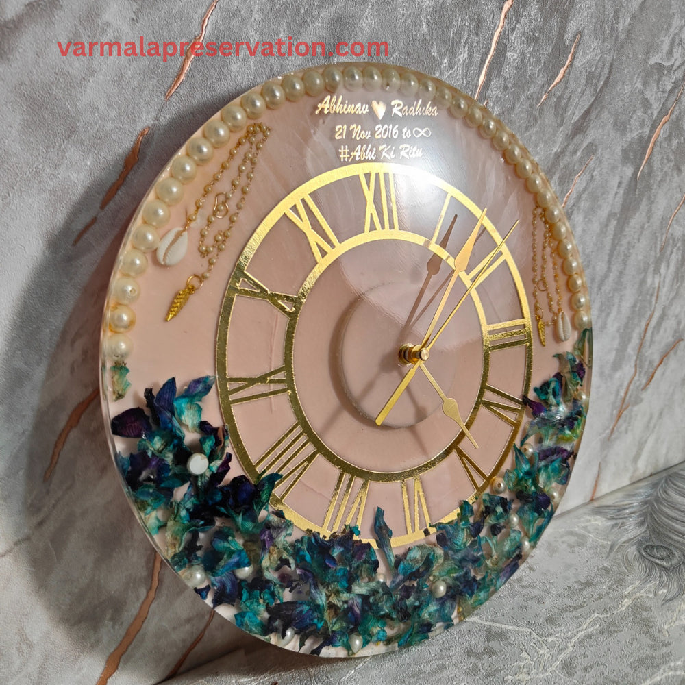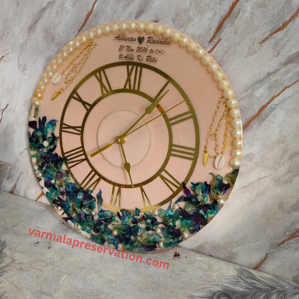 Indulge in the enchanting beauty of our Resin Dual Color Varmala Flower Wall Clock, a unique fusion of timekeeping and wedding memories preservation. This 12-inch clock doubles as a stunning piece of art, preserving the essence of your varmala ceremony in its intricate design. Perfect for newlyweds, this clock allows you to decorate your home with a personalized wedding touch, bringing back the joy of your special day with every tick. Ideal for wedding varmala preservation, jai mala preservation, and wedding flowers preservation, it serves as a heartfelt gift or a beautiful addition to your home decor. Discover the perfect blend of functionality and sentimentality with this exquisite timepiece.
